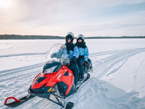 Na een heerlijke nacht en een lekker ontbijt mochten we onze pakken en schoenen ophalen die we de hele week mochten gebruiken. Allemaal super goed geregeld, want je begrijpt dat het in Lapland heeeel winters kan aanvoelen (zelfs nu in maart was de gevoelstemperatuur nog -15). Nadat we de pakken hadden aangetrokken kregen we een helm en was het tijd om het bevroren Inari meer te verkennen per sneeuwscooter. Een excursie van ruim 4 uur met lunch inbegrepen. Joost bestuurde de sneeuwscooter en ik zat lekker achterop. Het was zo indrukwekkend om te crossen over zo'n lege vlakte en je dan ondertussen te bedenken dat je op een bevroren meer rijdt, wauw! Wat we even vergeten waren, was doorgeven dat wij vegetarisch eten en dus kregen we bij de lunch een zalmsoep, oepsss! Lesje voor de volgende keer ;) Rond half 3 keerden we terug naar het hotel, we hadden even tijd om bij te komen van ons avontuur. Joost dook gelijk de sauna in, ik deed een dutje en na het diner was het tijd om op zoek te gaan naar het noorderlicht. Per slede achter een sneeuwscooter werden we naar een eilandje midden in het meer gebracht. Daar stond een tipi waarin onze gids een vuurtje stookte, zodat we tussendoor steeds even konden opwarmen. Het duurde ruim twee uur voordat het Noorderlicht zich liet zien, maar toen het eenmaal begon was het magisch. Al viel de kleur ons met het blote oog wat tegen. Het zijn meer grijs-witte schimmen dan echt felgroen zoals je camera wel vast legt. Rond half 11 waren we weer terug in het hotel. Na een warme douche vielen we in een diepe slaap.